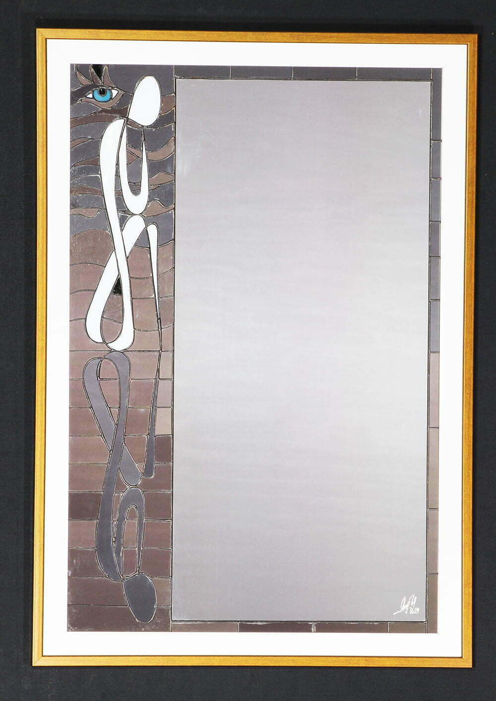Tehnică și materiale : Vitraliu în tehnica Tiffany din sticlă Murano și oglindă argintie, bronze și dark; ramă din lemn;
