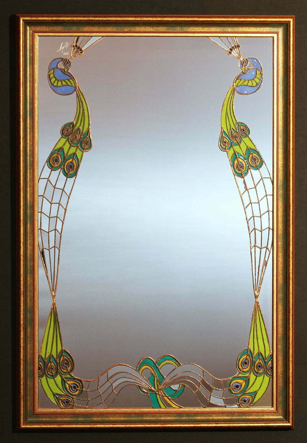 Tehnică și materiale : Vitraliu în tehnica Tiffany din sticlă de Murano, Spectrum și oglindă; ramă din lemn;